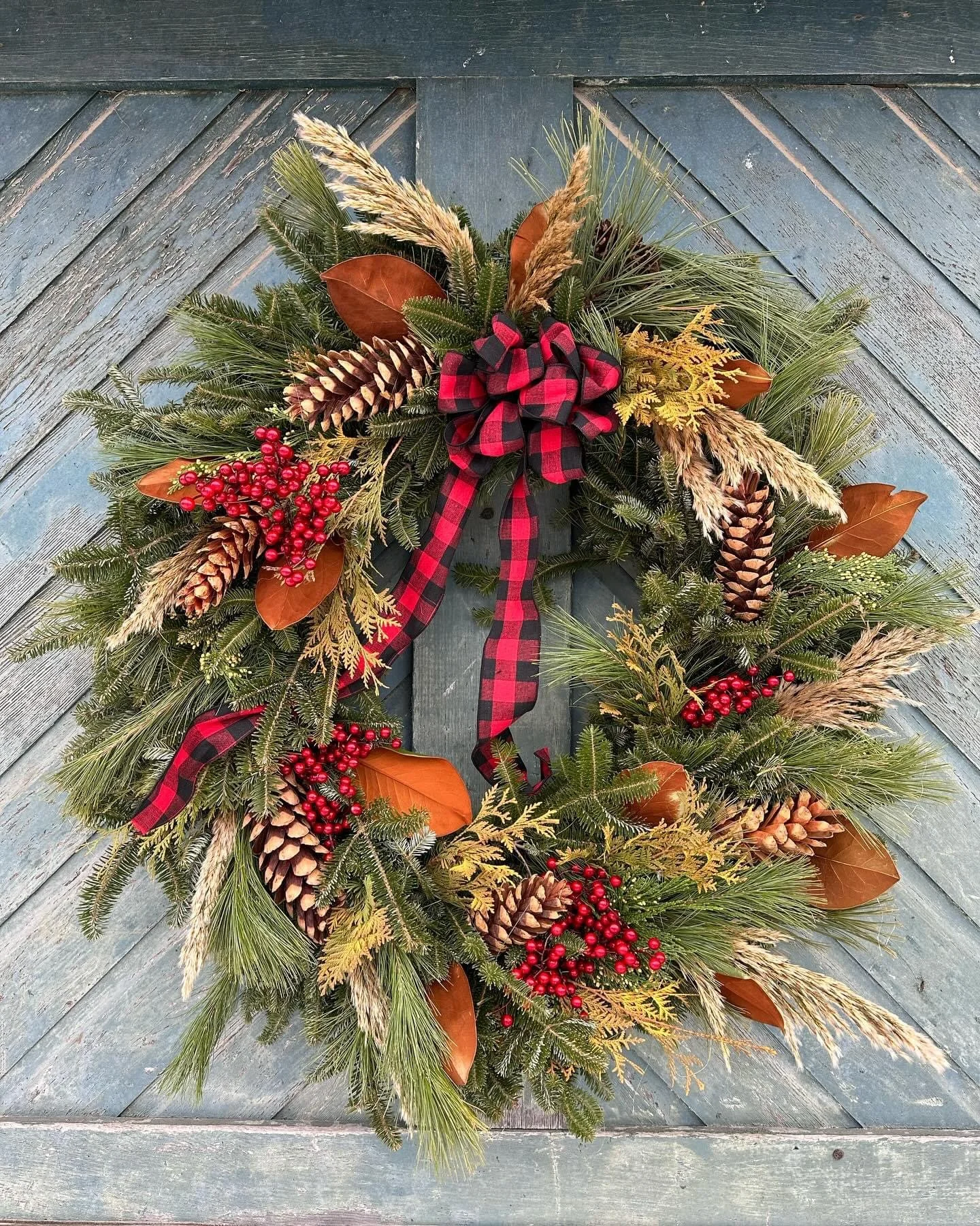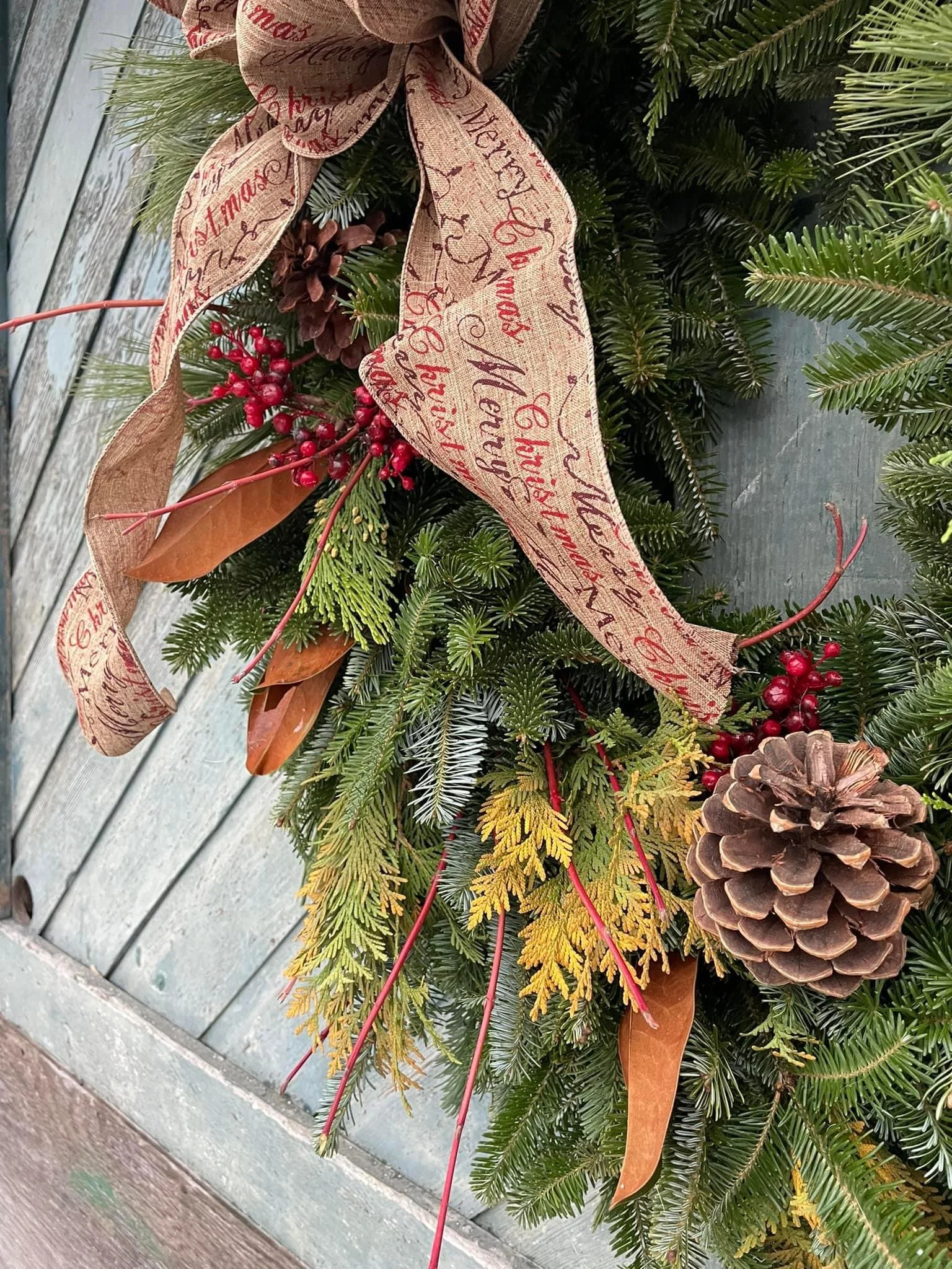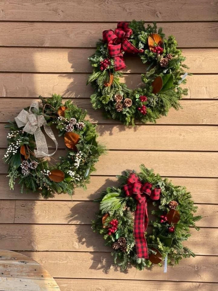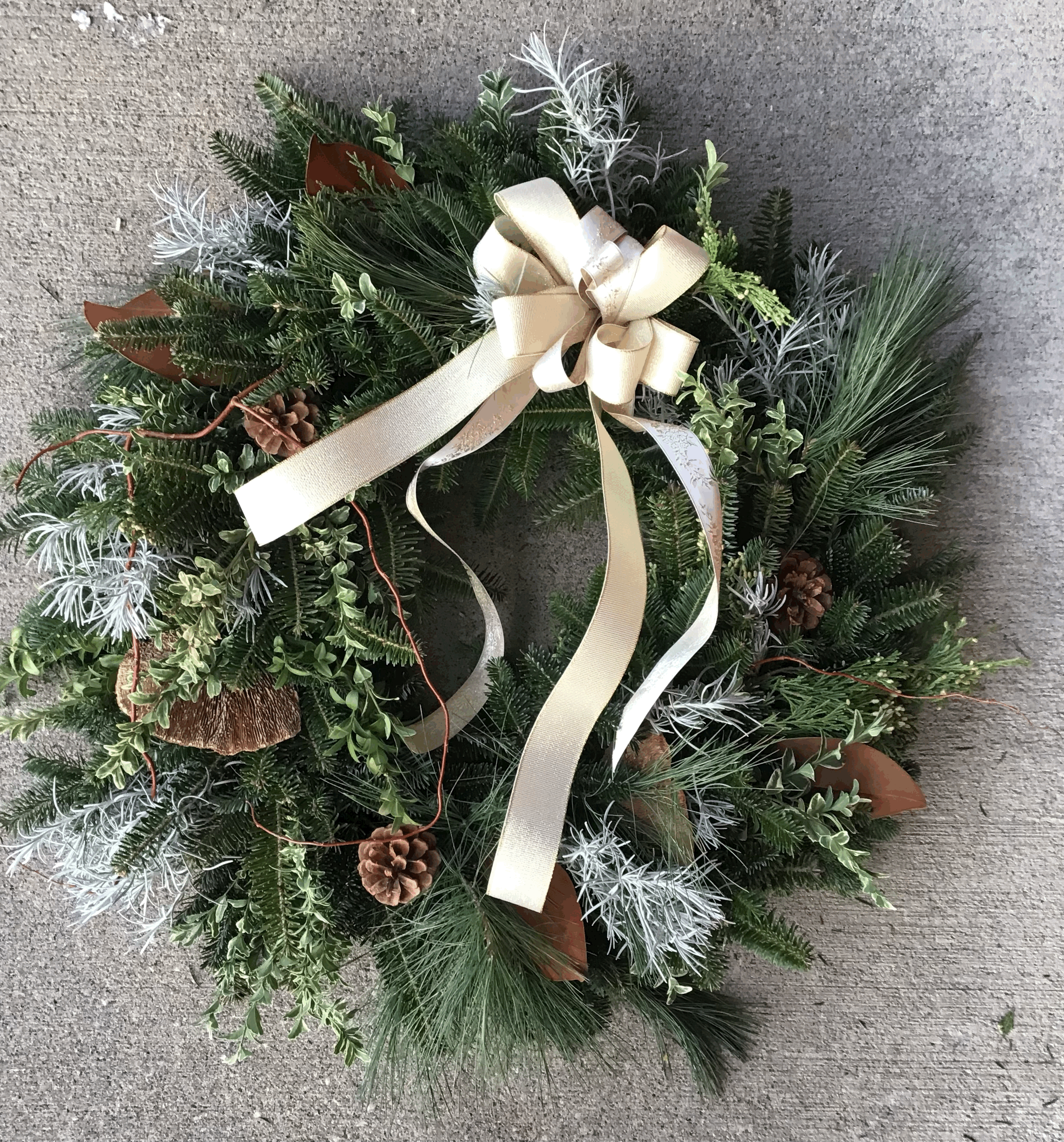 Our custom made fresh winter wreaths are a beautiful addition to any home entry! Our “Classic” Winter Wreath is 18”-21” wide and comes with a mix of evergreens, pinecones, berries, and textural seasonal elements for $75. The “Deluxe” Winter Wreath is a larger version, at 30”, and full of pinecones, berries, magnolia leaves, curly willow and other seasonal textures. Add a choice of bow color to your order and we will make a wreath especially for you to pick up or have delivered.